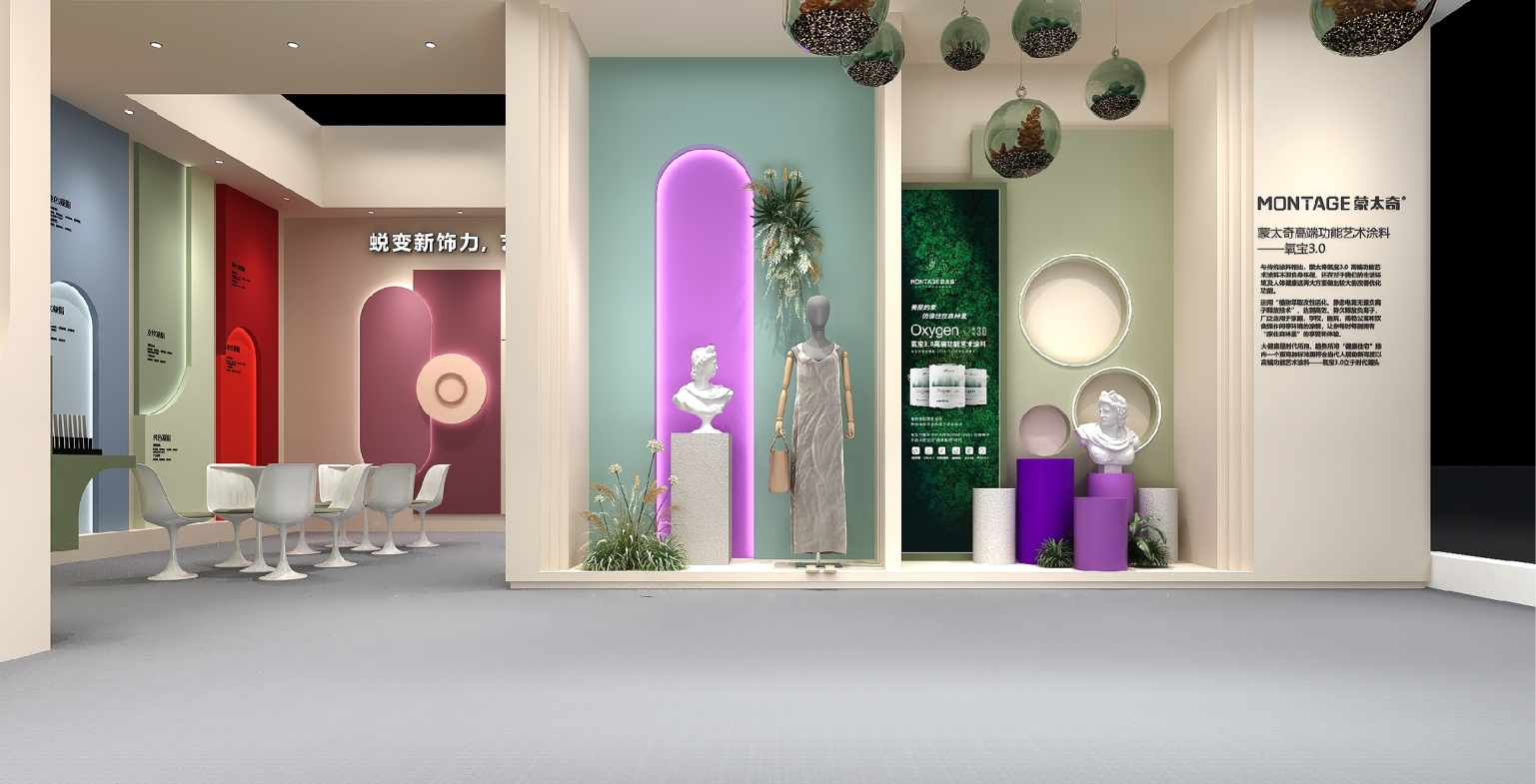 當(dāng)“藝術(shù)蒙太奇”“藝術(shù)=蒙太奇”符咒營銷的序幕一旦拉開,撲面而來的只有傳承與創(chuàng)新。2024年廣州建博會,蒙太奇展館雖然仍舊以“一起森呼吸·藝術(shù)蒙太奇”為主題,仍然以“氧寶3.0系列高端負(fù)氧離子功能藝術(shù)涂料”為主打,但蛻變的力量給了我們更多的驚艷:以蒙太奇品牌獨特元素的“M”作為基本造型,以象征創(chuàng)新生命力的“破繭成蝶為框架,輔以象征吉祥美好的“東來紫氣”為聚焦色,在110㎡的場地里營造了一個負(fù)氧離子功能藝術(shù)涂料溫潤下的持續(xù)生長的美好空間。
