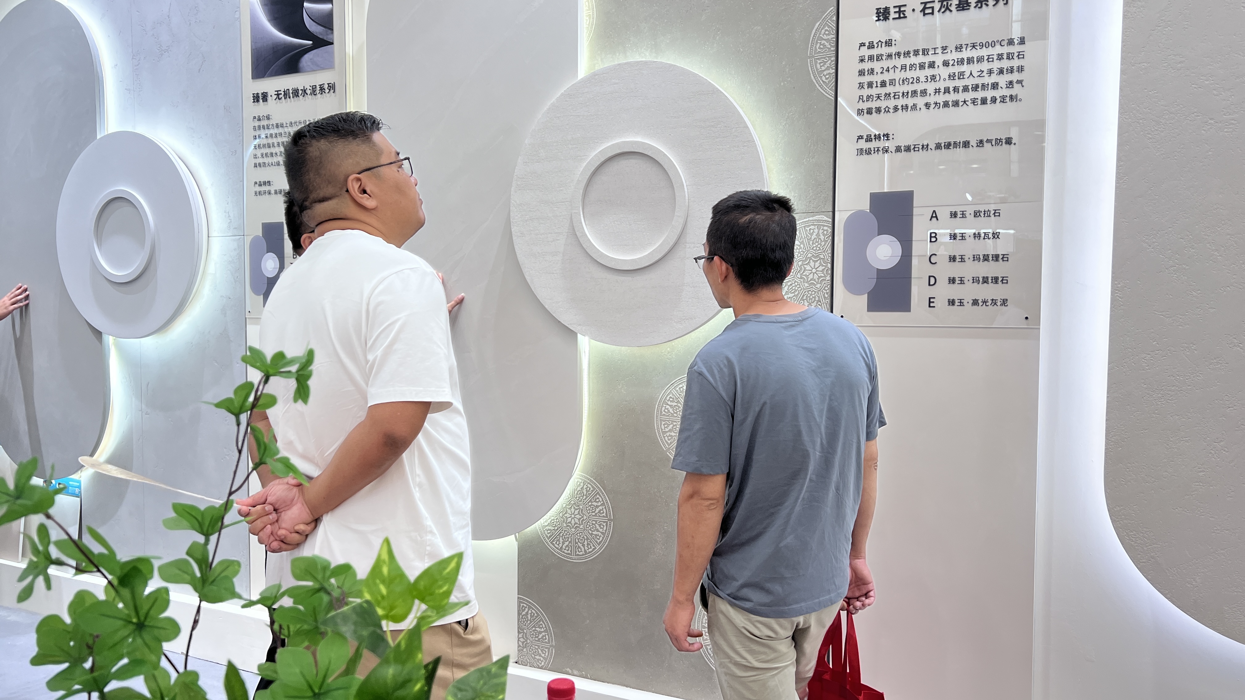 同時,蒙太奇攜具有接近天然石材的原生美感的臻石高定系列新品震撼首秀,包括臻奢·無機微水泥系列、臻玉·石灰基系列、臻巖·萊姆石系列、臻石·天然礦石系列,這些重磅新品吸引了眾多觀展人員駐足觀看和咨詢。