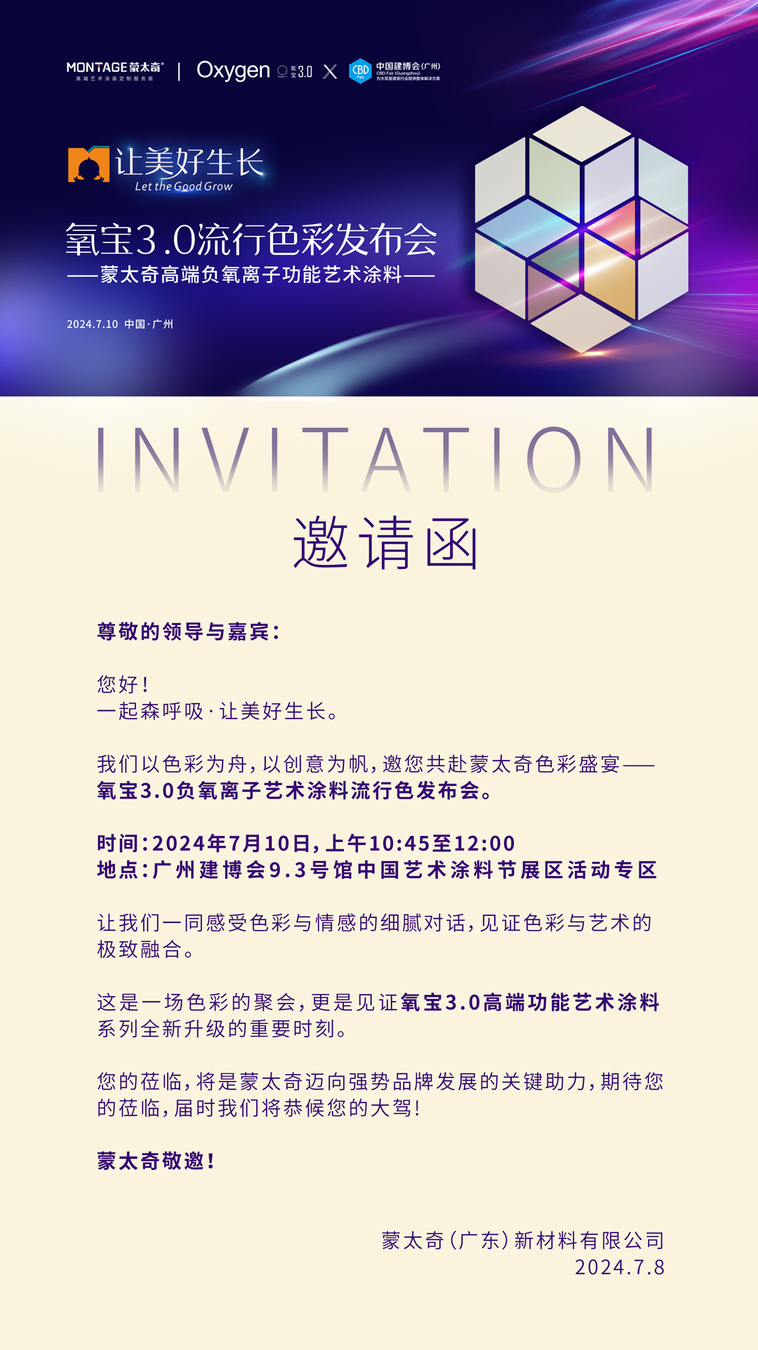本次展會中,備受期待的蒙太奇氧寶3.0負氧離子藝術涂料流行色發(fā)布會,定于7月10日早上10:45至12:00正式啟幕,屆時揭秘氧寶3.0負氧離子藝術涂料技術與色彩蛻變的力量。誠邀您一起探索,從色彩的應用,感知家居美學。