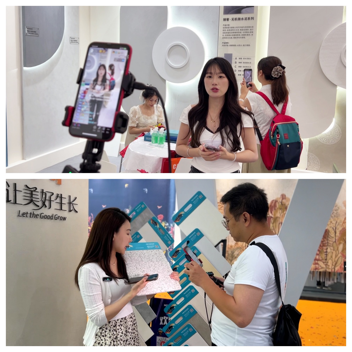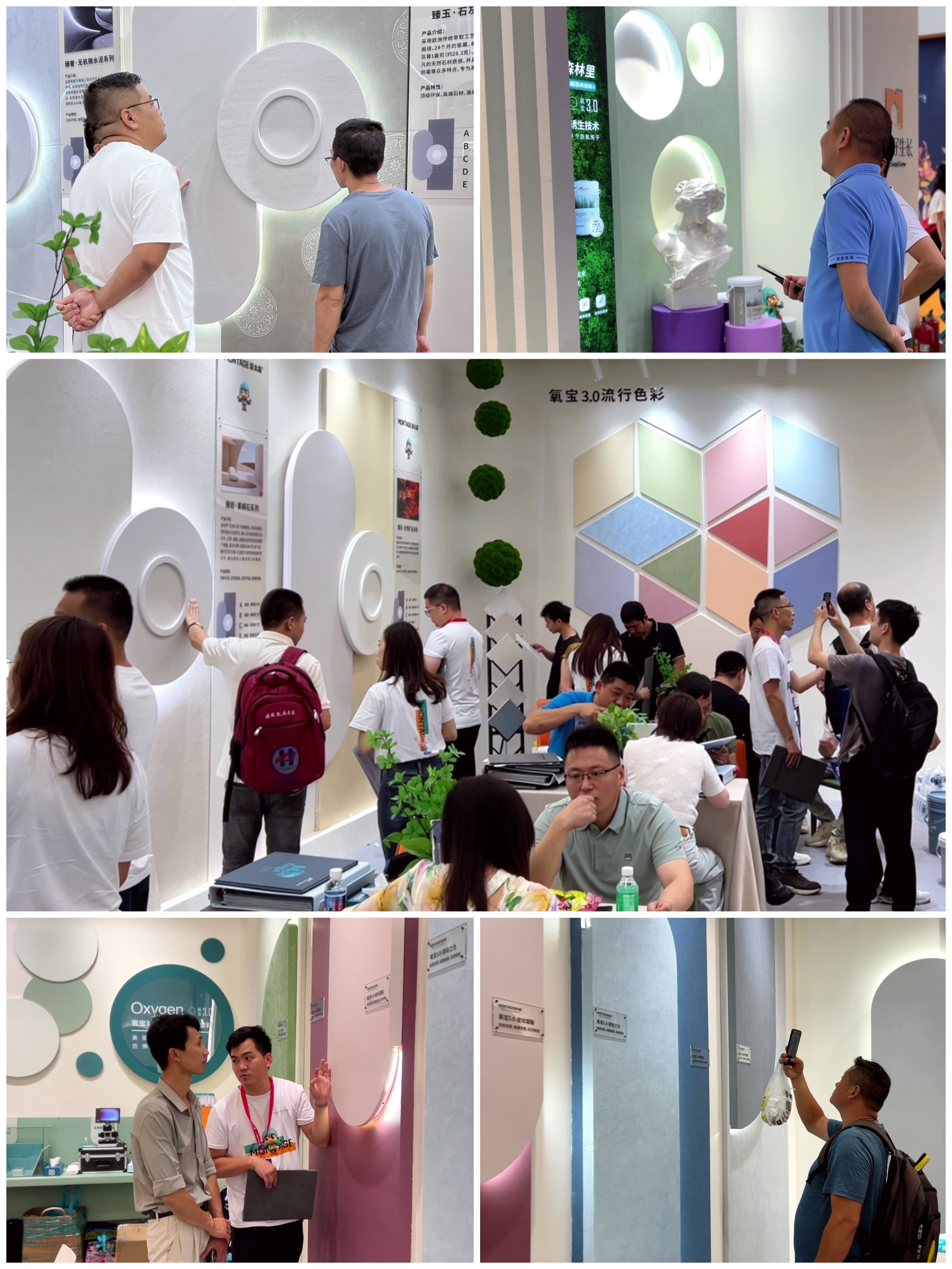 蒙太奇憑借強勁的品牌號召力,展位內(nèi)人海如潮,咨詢者絡繹不絕。其中,氧寶3.0高端功能藝術涂料體驗區(qū)、臻石高定石材藝術涂料體驗區(qū)、原裝進口高定工藝藝術涂料體驗區(qū)尤為熱鬧,每一款產(chǎn)品墻都展現(xiàn)了獨特的美感,吸引了眾多參觀者云集,讓觀眾零距離、沉浸式感受“會呼吸”的墻。