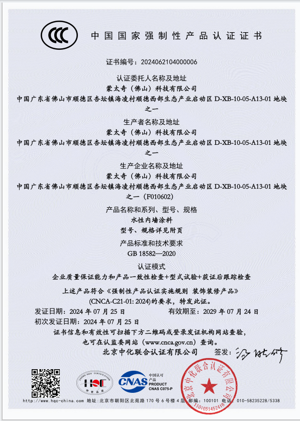 006號(hào) | 蒙太奇首批通過(guò)獲得水性內(nèi)墻涂料產(chǎn)品3C認(rèn)證證書(shū)