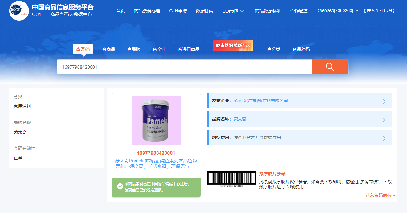 登錄中國商品信息服務(wù)平臺(https://www.gds.org.cn/#/home/index),輸入條形碼,即可進(jìn)行信息查詢。蒙太奇全系列產(chǎn)品的“加碼”工作正將逐步完善中,敬請期待。