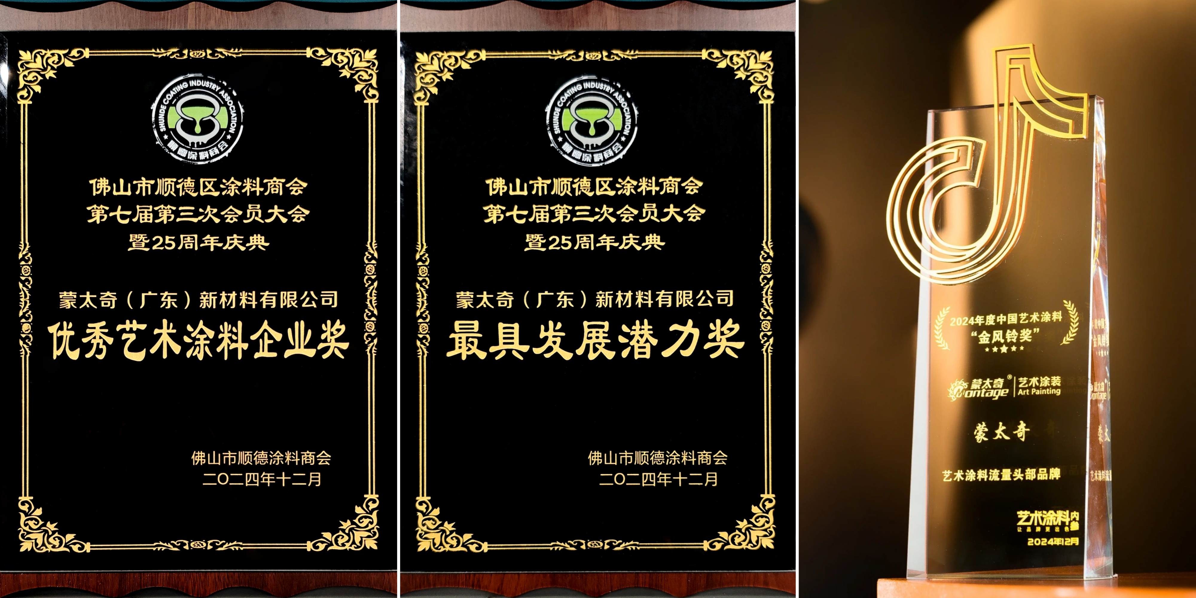 蒙太奇藝術(shù)漆深耕藝術(shù)涂料領(lǐng)域經(jīng)年,始終堅(jiān)持以技術(shù)創(chuàng)新驅(qū)動(dòng)生產(chǎn)布局與研發(fā)實(shí)力升級(jí),憑借前瞻性的終端賦能策略,企業(yè)前后榮膺順德涂料商會(huì)頒發(fā)的“最具發(fā)展?jié)摿Κ?jiǎng)”及“優(yōu)秀藝術(shù)涂料企業(yè)獎(jiǎng)”、更在2024中國(guó)藝術(shù)涂料金風(fēng)鈴評(píng)選中斬獲“藝術(shù)涂料流量頭部品牌”殊榮 。