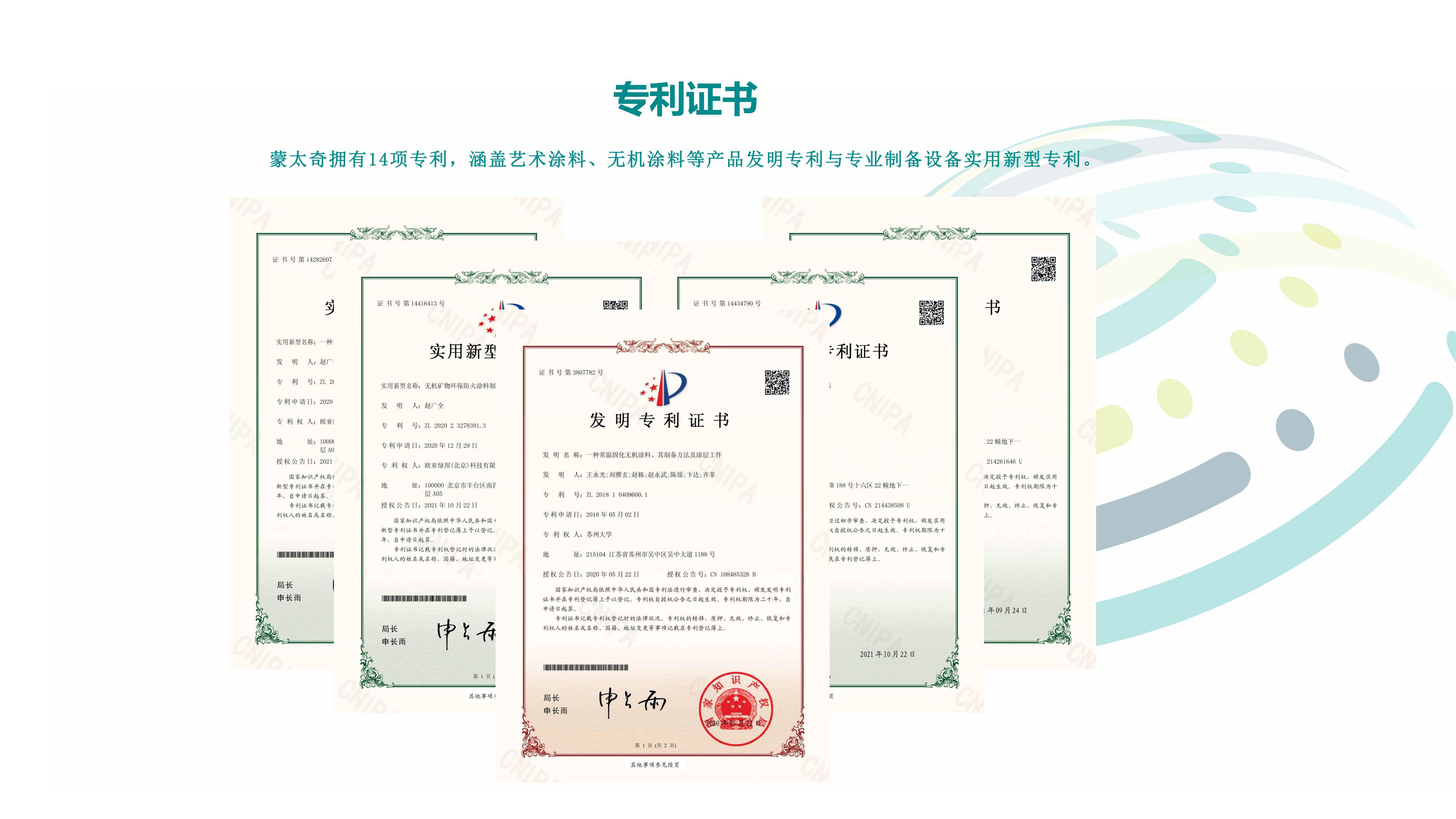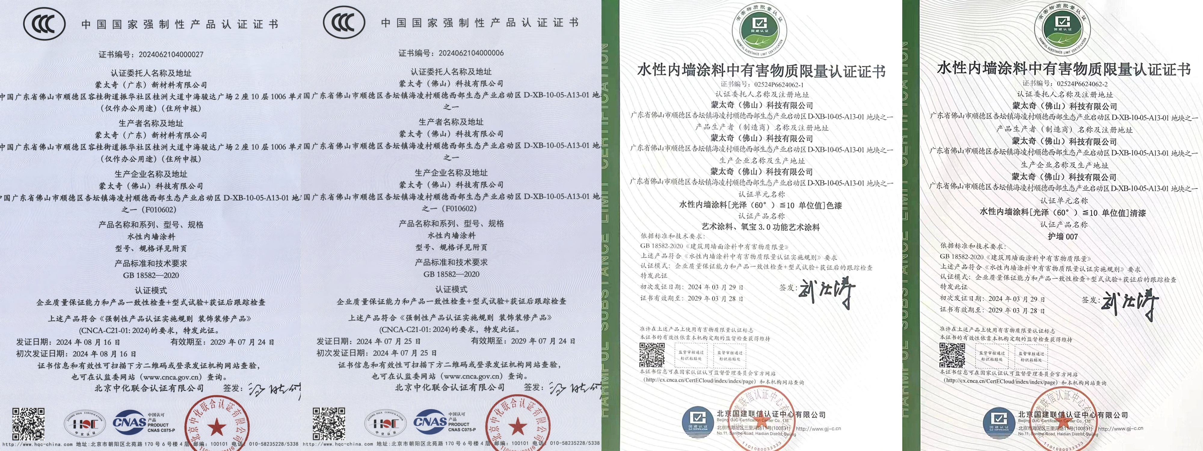 在此專利獲準前,蒙太奇已擁有14項專利,涵蓋藝術涂料、無機涂料等產品發(fā)明專利與專業(yè)制備設備實用新型專利。在嚴格遵循國家標準、通過基礎認證的基礎上,蒙太奇主動對標國際先進水平,成為行業(yè)首批獲得《水性內墻涂料中有害物質限量認證》及3C強制產品認證的雙資質品牌。這些技術成果與權威認證的積累,不僅印證了蒙太奇的研發(fā)實力,更為藝術涂料行業(yè)的標準化建設添磚加瓦,推動行業(yè)邁向新高度。