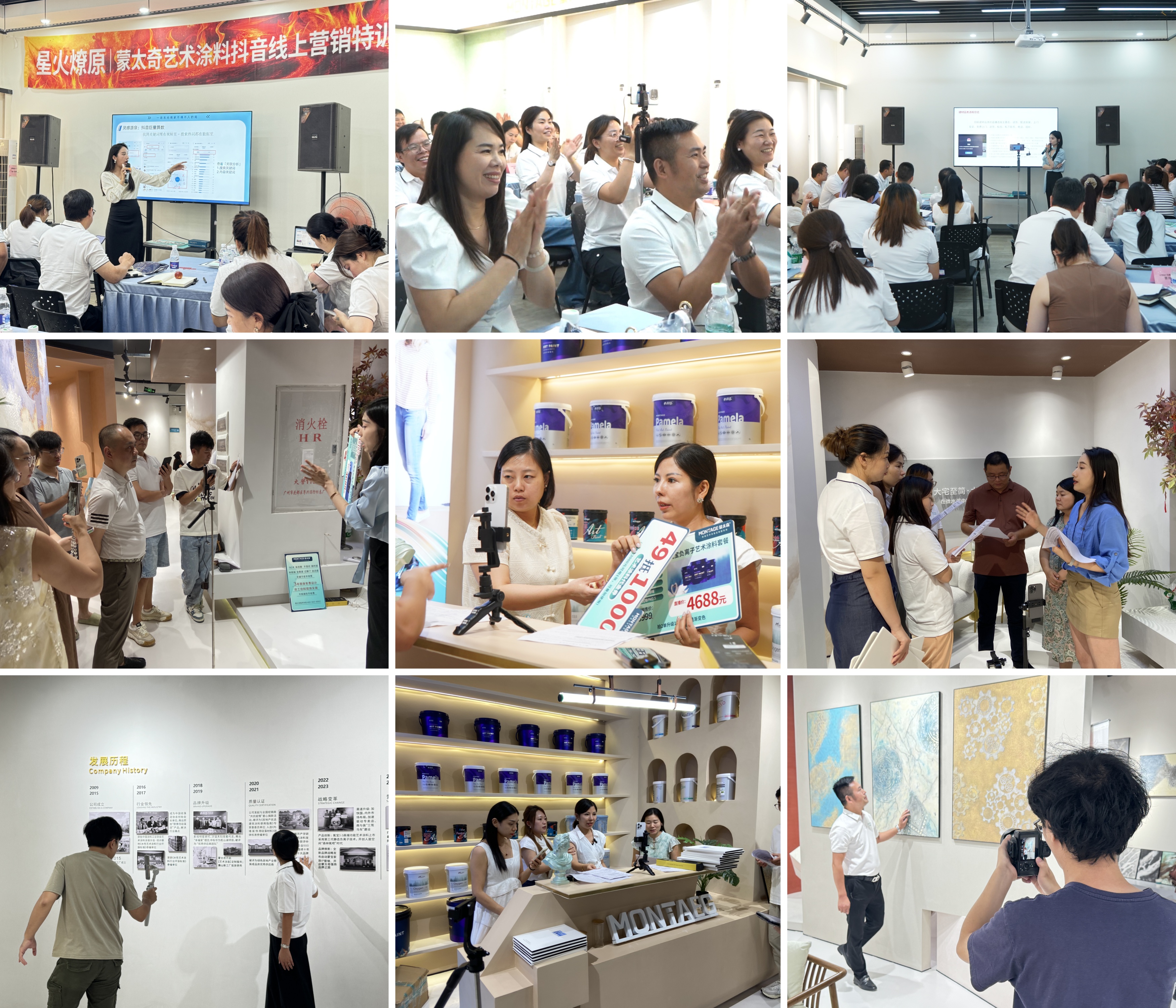 另一方面離不開蒙太奇的深化終端流量賦能之路, 已成功開展多期“新媒體流量特訓(xùn)營”,蒙太奇藝術(shù)涂料總部手把手賦能終端門店掌握短視頻創(chuàng)作、直播運營、粉絲互動等數(shù)字化營銷硬核技能。此舉有效助力單店突破地域限制,打造區(qū)域流量標桿,讓經(jīng)銷商切實共享平臺流量紅利。