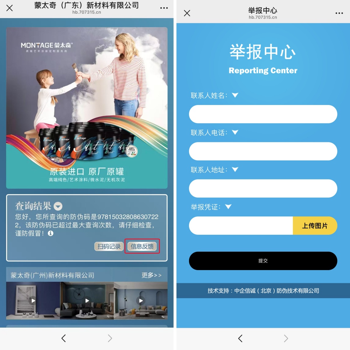 若顯示【非官方正品】,則該產品存在假冒風險,可聯(lián)系【MONTAGE蒙太奇藝術涂裝】公眾號,提供防偽碼及購買憑證進行二次核驗。