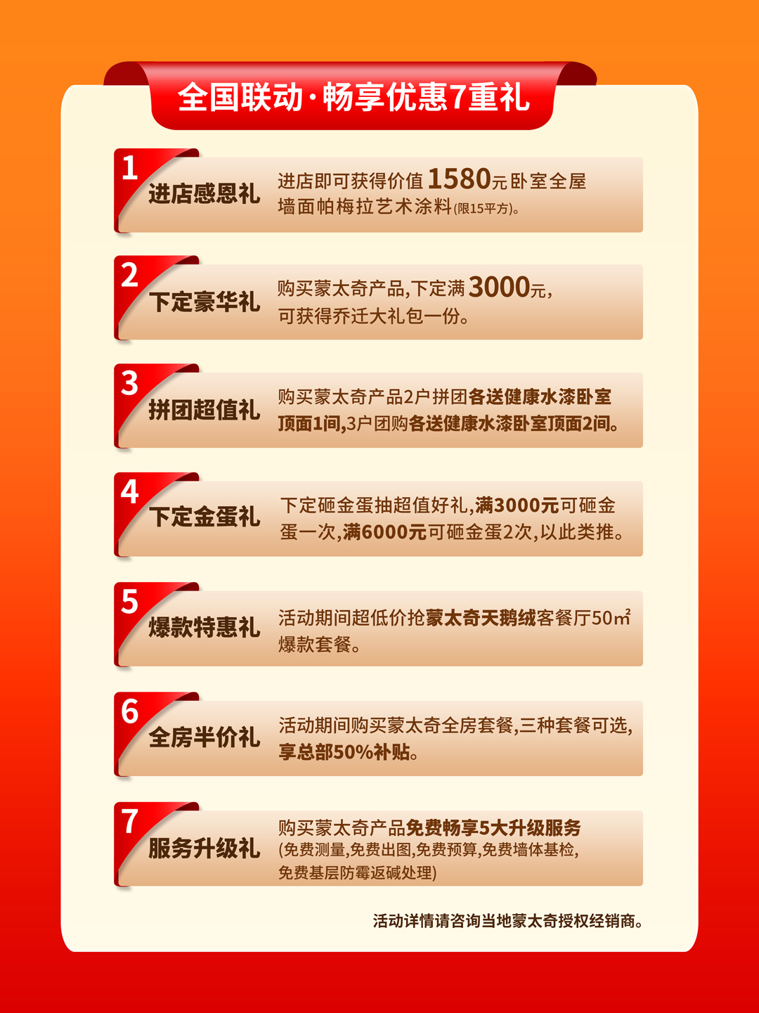 蒙太奇618年中大促作為2024年上半年第一場大型活動,遇上家裝旺季,正是沖量爆發(fā)的重要時(shí)期,為客戶帶來誠意滿滿的裝修福利,提供「進(jìn)店感恩禮、下定豪華禮、拼團(tuán)超值禮、下定金蛋禮、爆款特惠禮、全房半價(jià)禮、服務(wù)升級禮」等多重升級豪禮。