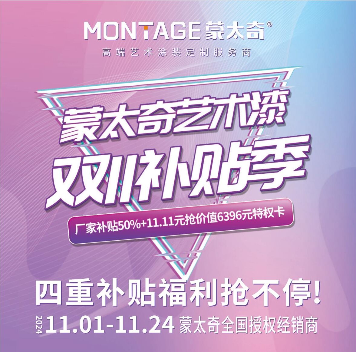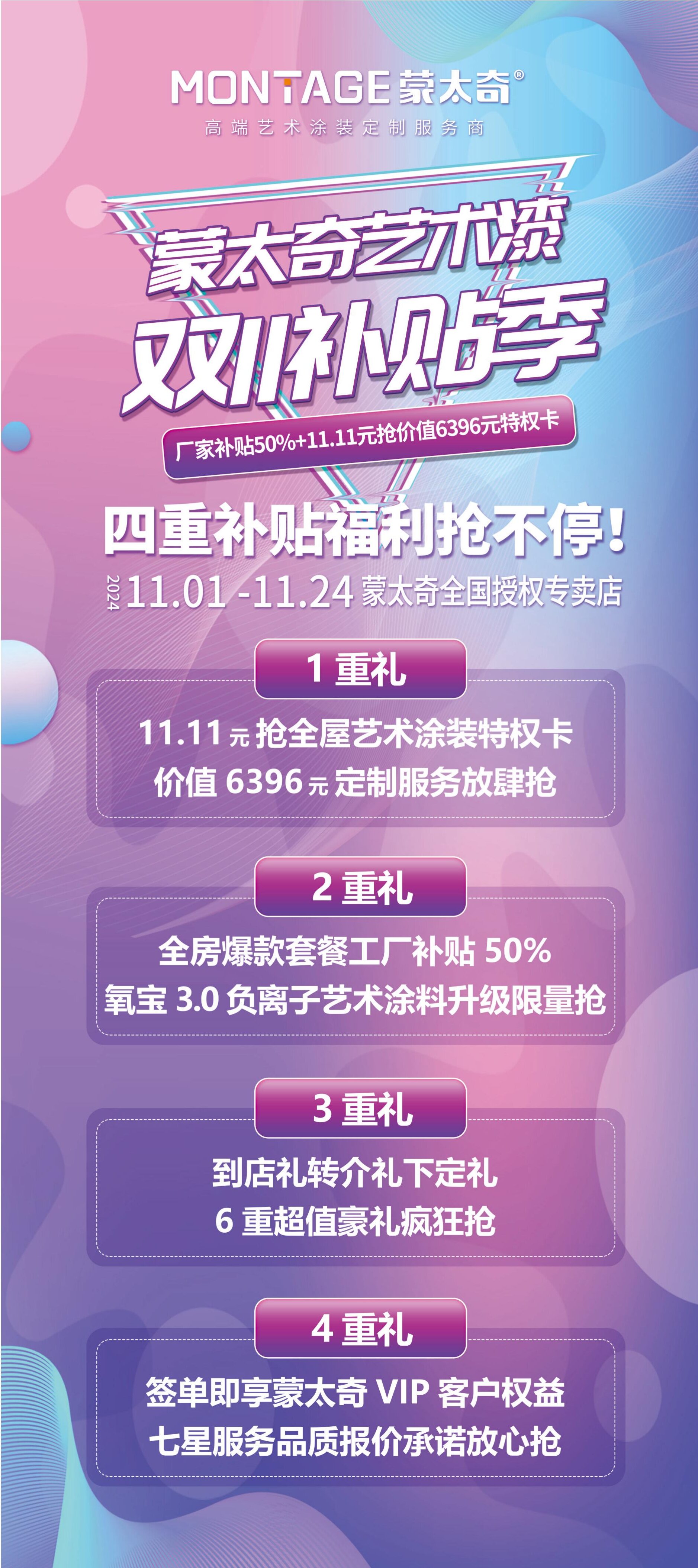 快把好消息傳開!有新房裝修或者老房改造需求的朋友有福了!蒙太奇推出雙11補(bǔ)貼季活動(dòng),不管是裝新家還是舊房煥新,都能享受廠家直接補(bǔ)貼,真正享受活動(dòng)優(yōu)惠。補(bǔ)貼又逢雙11,折上再折不容錯(cuò)過!我們提供多重免費(fèi)、VIP煥新等承諾,用優(yōu)惠的價(jià)格享受高品質(zhì),雙11來蒙太奇一次省到底,幫您輕松拿下全屋藝術(shù)涂裝。
