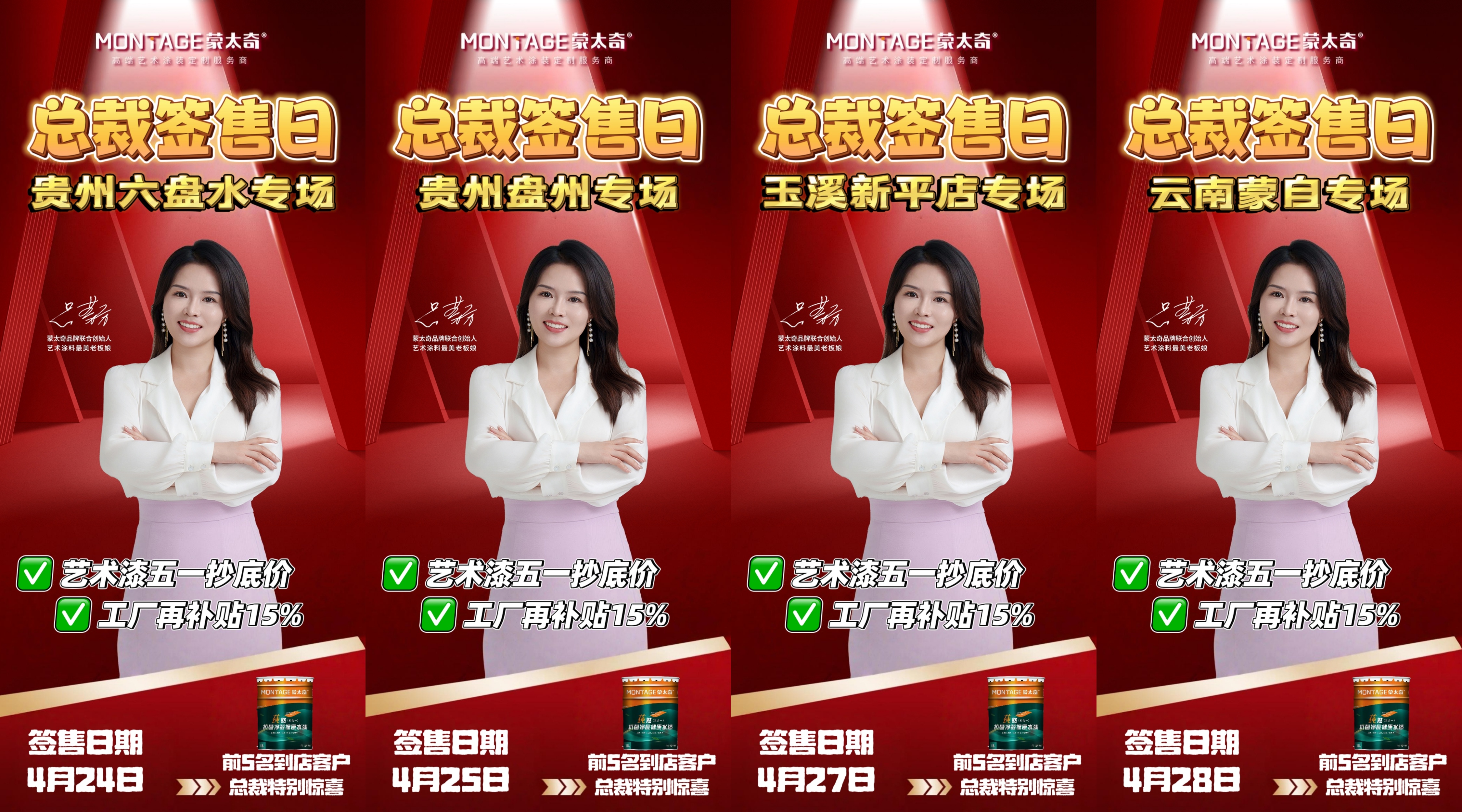 活動期間,蒙太奇聯(lián)合創(chuàng)始人、藝術涂料最美老板娘呂芳方親臨一線駐店幫扶,以行業(yè)領袖的專業(yè)力與親和力賦能終端。4場總裁簽售日活動火力全開,為六盤水店、盤州店、新平店、蒙自店注入強勁動能,大大激增單日簽單量,點燃搶購熱潮!
