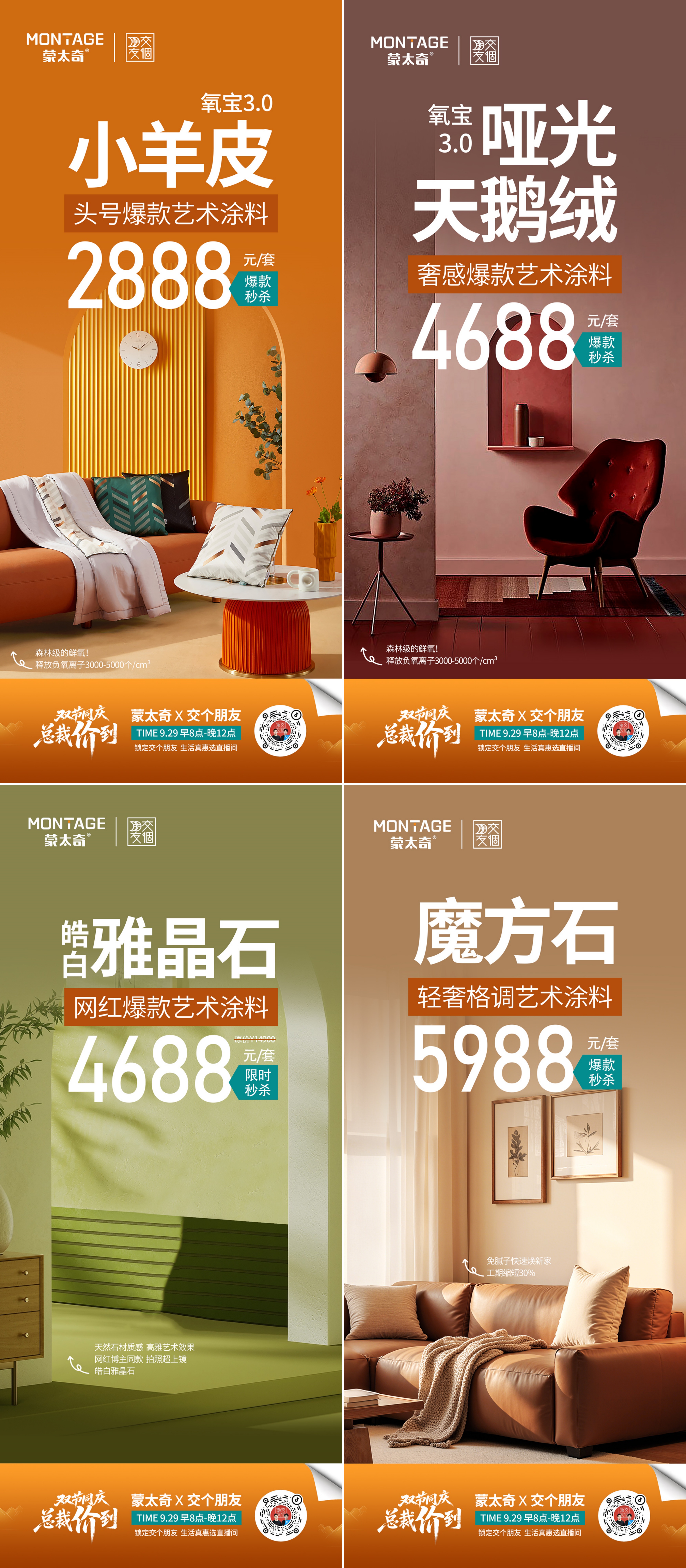 直播福利重磅加碼,多套爆款藝術(shù)涂料限時(shí)秒殺!氧寶3.0小羊皮僅需2888元,氧寶3.0啞光天鵝絨、皓白雅晶石雙雙直降至4688元,魔方石更享5988元爆款驚喜價(jià)!不僅如此,蒙太奇更推出“全房藝術(shù)漆核銷禮”,可享受免費(fèi)升級(jí)護(hù)墻007工藝或墻面基層加固工藝;享受免費(fèi)量尺+設(shè)計(jì)方案+三年維保特權(quán);同時(shí)更有買墻送頂,30天內(nèi)全房核銷領(lǐng)取1198元“五合一健康水漆”1桶等特權(quán),助你輕松打造會(huì)呼吸的健康家居空間!