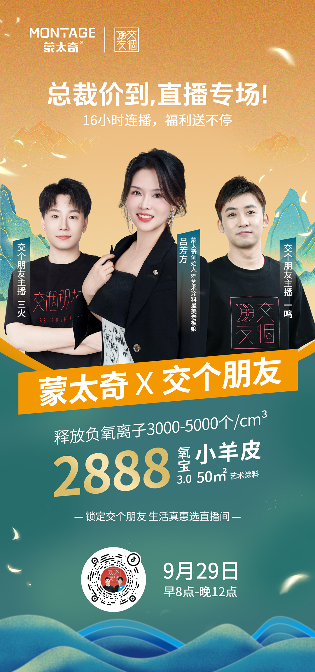 這個(gè)國(guó)慶,讓家煥然一新!9月29日早8點(diǎn)-晚12點(diǎn),蒙太奇藝術(shù)涂料將攜手“交個(gè)朋友生活真惠選”直播間,點(diǎn)燃國(guó)慶家裝大促熱潮!一場(chǎng)長(zhǎng)達(dá)16小時(shí)的超值直播,蒙太奇藝術(shù)涂料帶來多款高顏值、高性能的藝術(shù)涂料爆品,更有超值補(bǔ)貼、限時(shí)秒殺等重磅福利,為消費(fèi)者帶來高品質(zhì)家居煥新體驗(yàn),用藝術(shù)漆點(diǎn)亮質(zhì)感生活,讓每一面墻都成為家的風(fēng)景。